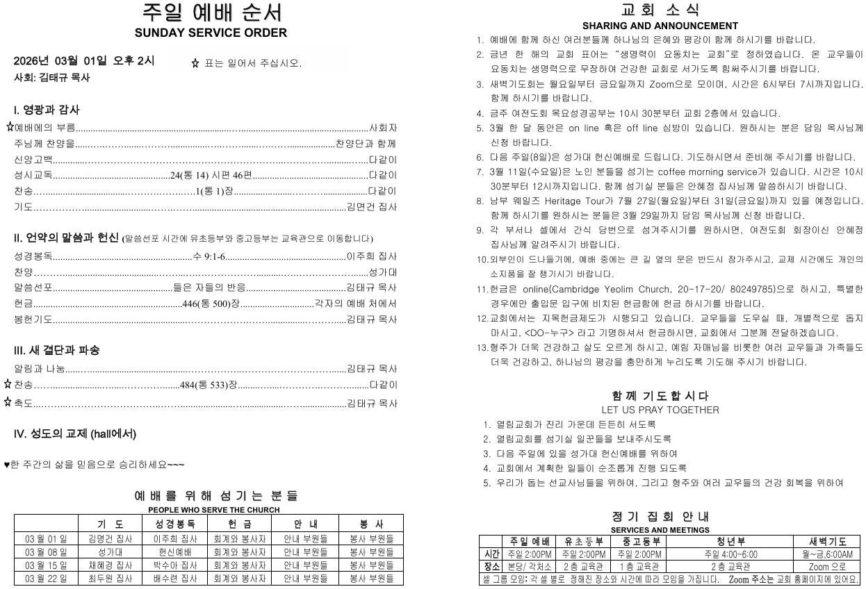 1. 주일예배는 대면과 비대면 예배로 드립니다. 비대면 접속은 Zoom으로 1시 45분부터 가능하며, 접속 사이트와 ID는 아래와 같습니다. 새벽기도회 접속도 동일합니다.https://us02web.zoom.us/j/2642781327?pwd=aHVleGxZeFJBL3dHSTk0bjNQWVQwUT09